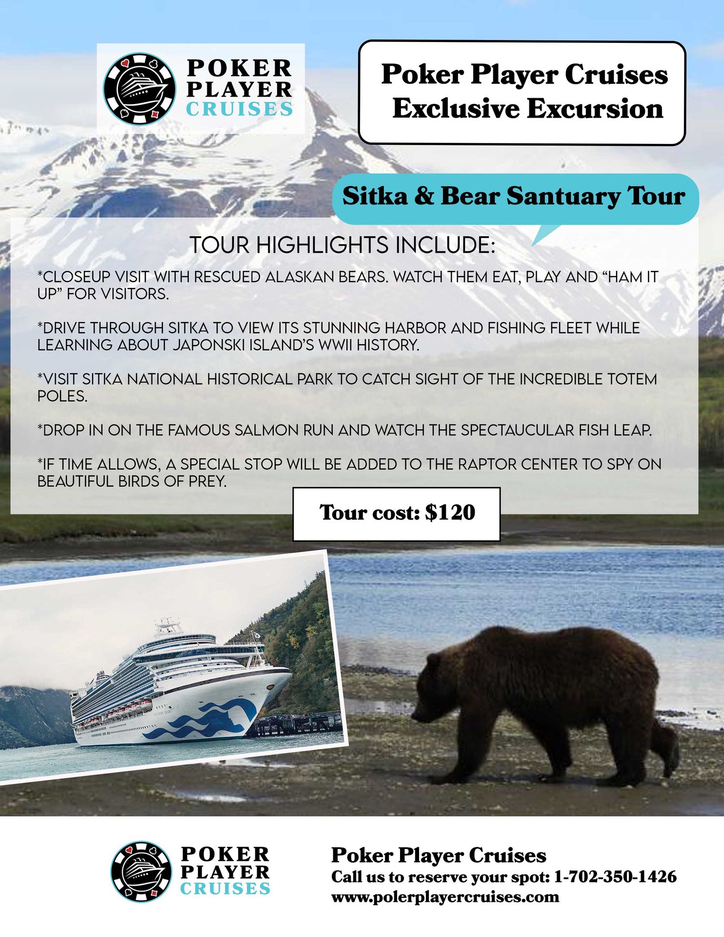 8/16 Sitka: Join Poker Player Cruises for an unforgettable private excursion in Sitka, Alaska! Led by locals in 10-passenger vans, you'll skip the crowded buses to experience the region's top highlights. See rescued Alaskan bears up close, view the salmon run, explore majestic totem poles at Sitka National Historical Park, and visit an eagle raptor center. You'll also take in the stunning harbor and WWII history.Space is limited!