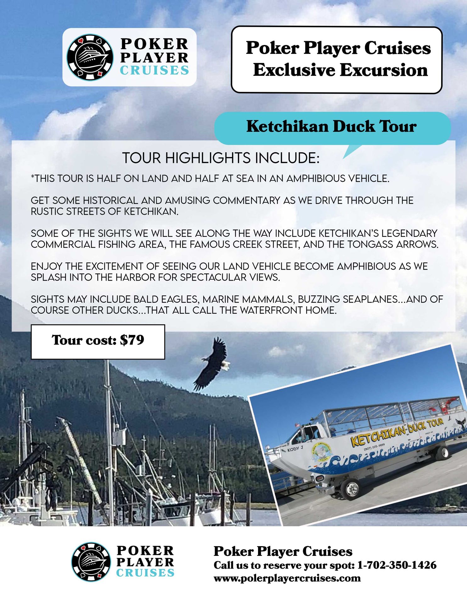 8/17 Ketchikan: Join Poker Player Cruises for the exclusive Ketchikan Duck Tour! For just $79, this amphibious adventure takes you half on land and half at sea. Enjoy fun, historical commentary as you drive past Creek Street and the commercial fishing area. Then, splash into the harbor for spectacular views of bald eagles, marine mammals, and seaplanes.